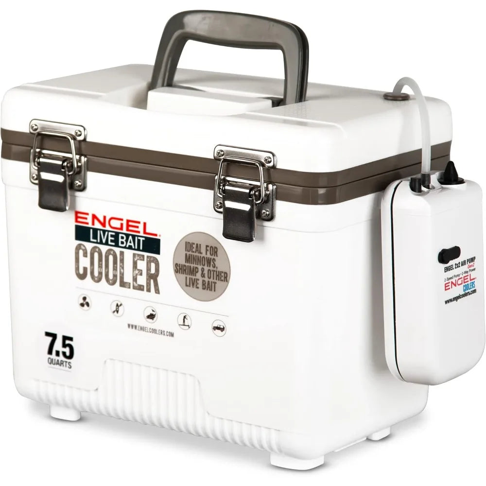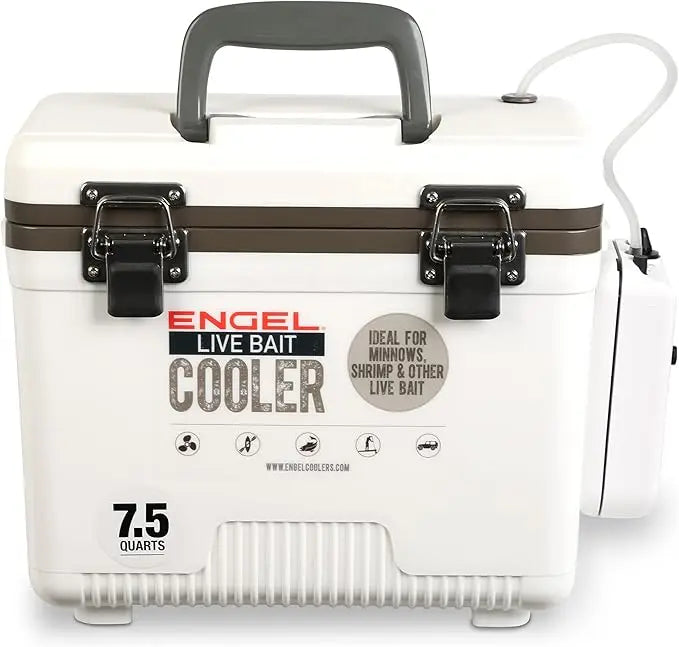 Engel Live Bait Cooler Box with 2nd Gen 2-Speed Aerator Pump — a portable fishing station and minnow bucket designed to keep shrimp and other live bait healthy and ready. Built for anglers who demand reliable, mobile bait storage with superior aeration and ease of use.