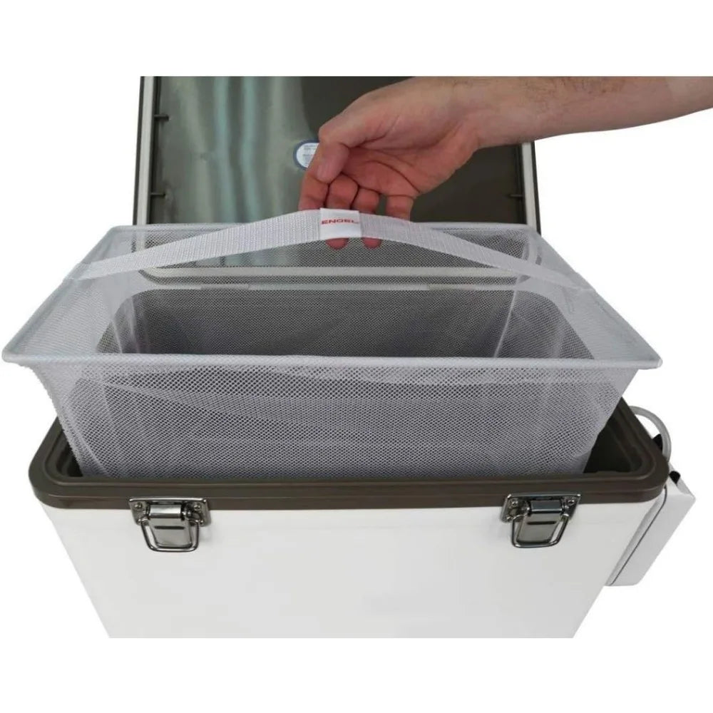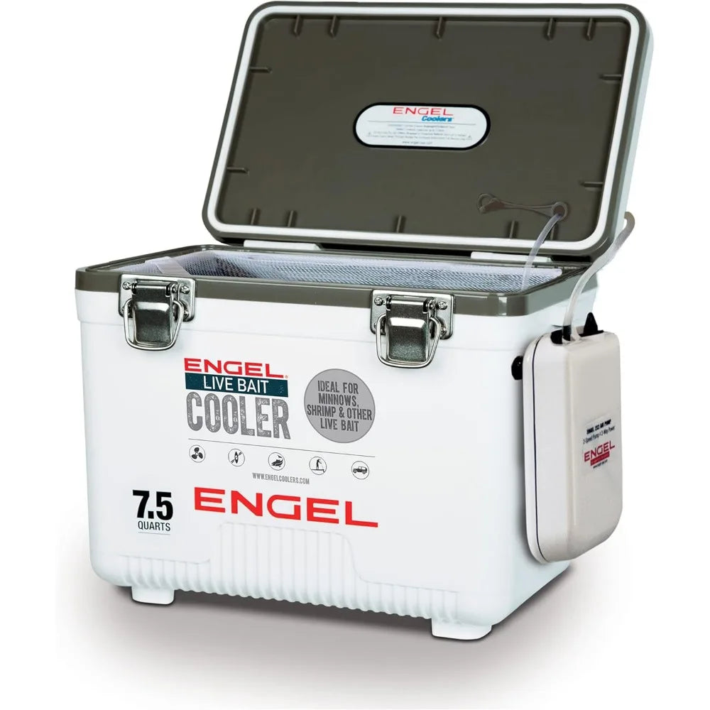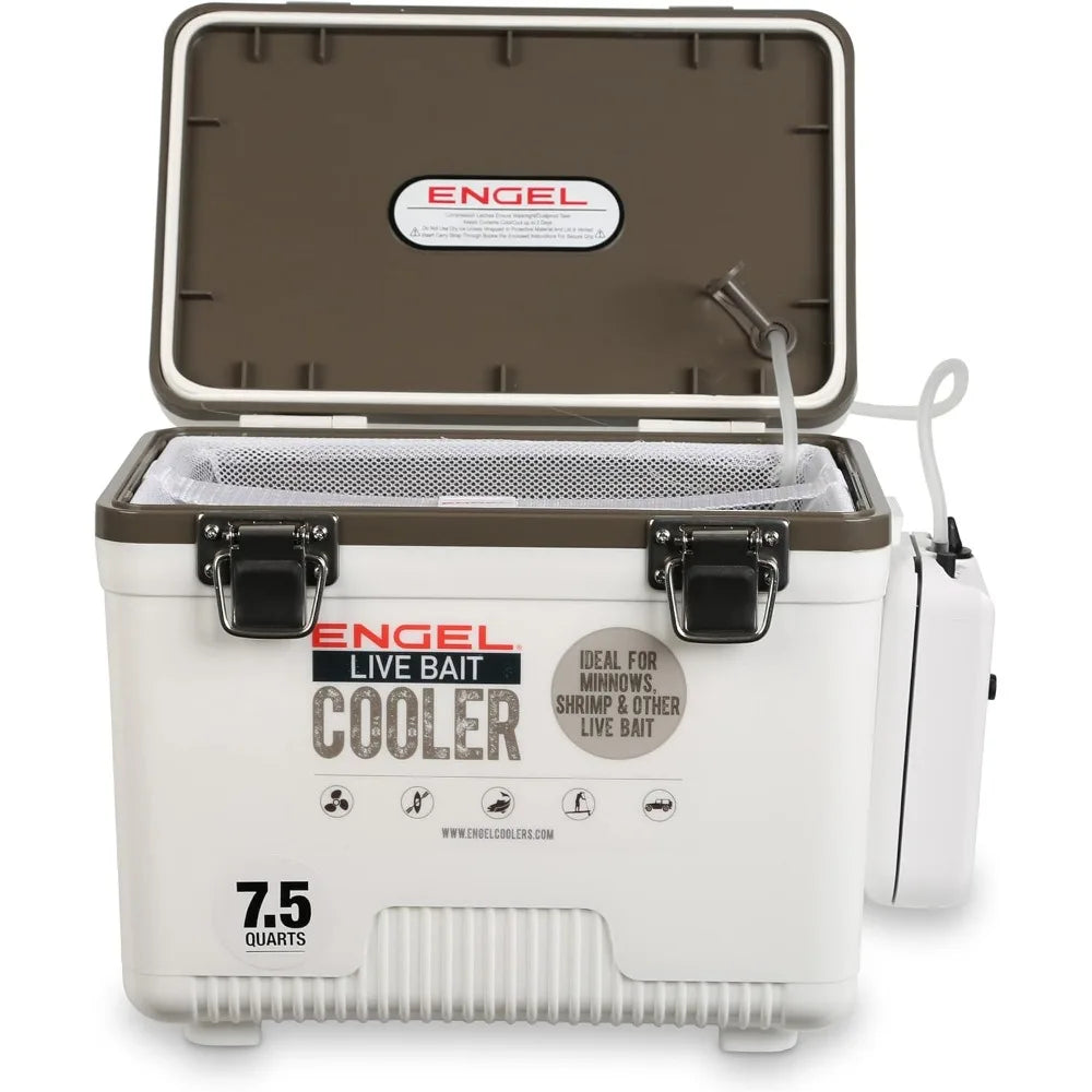 Includes: 75-quart Engel live bait cooler, removable easypull net, 2nd Generation battery-operated 2-speed aerator pump. Color: White. Origin: US.