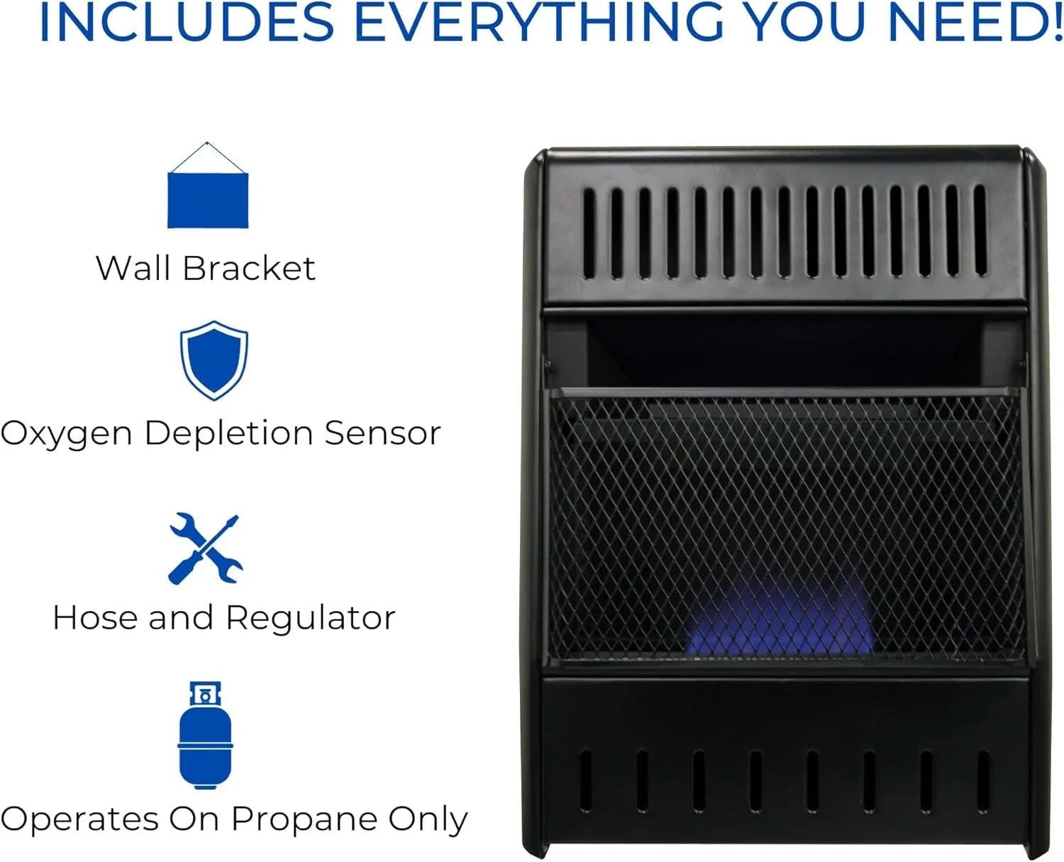 Discover reliable comfort with the ML100TBAHR Ventless Propane Heater with Thermostat in a sleek Black finish. This compact unit delivers 10,000 BTU of steady warmth for spaces up to 300 square feet, making it ideal for living rooms, bedrooms, or workshops. The blue flame ensures efficient heating, while the built-in thermostat helps maintain your selected temperature for consistent comfort without the need for vents.